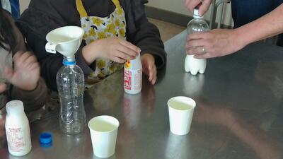 稚内牛乳を入れたペットボトルを、子どもたちはひたすら振っていました。