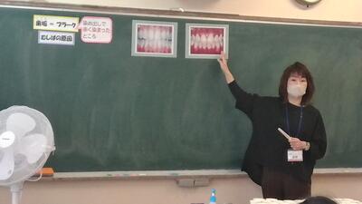 今日は4年生で歯科衛生士さんによる歯磨き指導がありました。