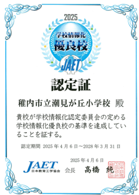 日本教育工学協会は、学校教育にかかわる教員・研究者・企業が教育工学研究を通して、広くその成果を共有し、普及啓発活動をもとに、わが国の教育の向上に資するために組織化された団体です。教育の情報化に総合的に取り組み,情報化によって教育の質の向上を実現している学校を学校情報化優良校として認定されるものです。