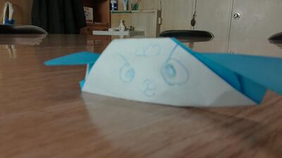 折り紙で折った犬をプレゼントしてくる1年生。